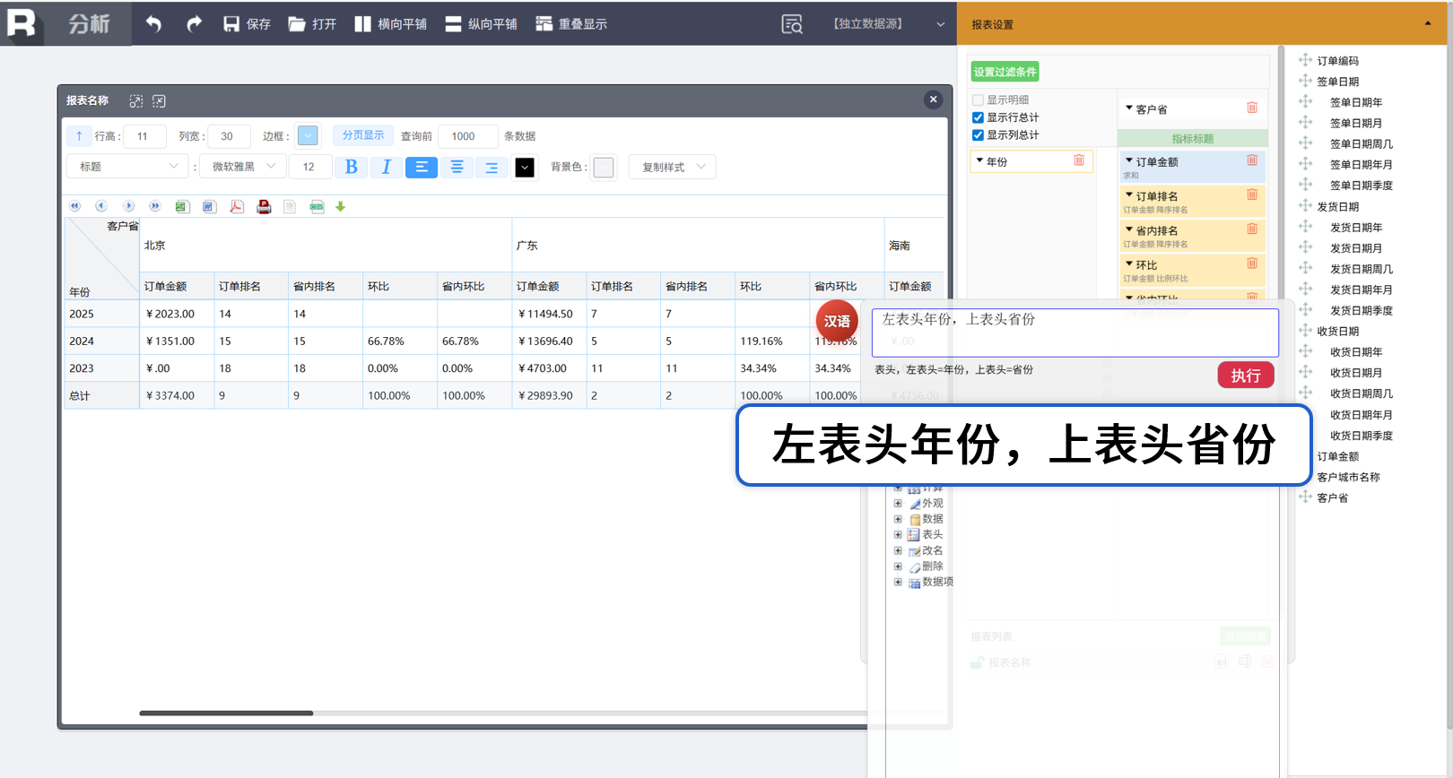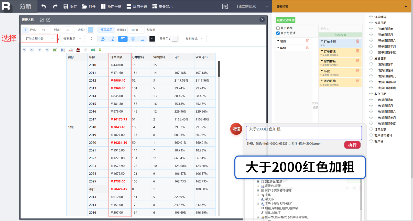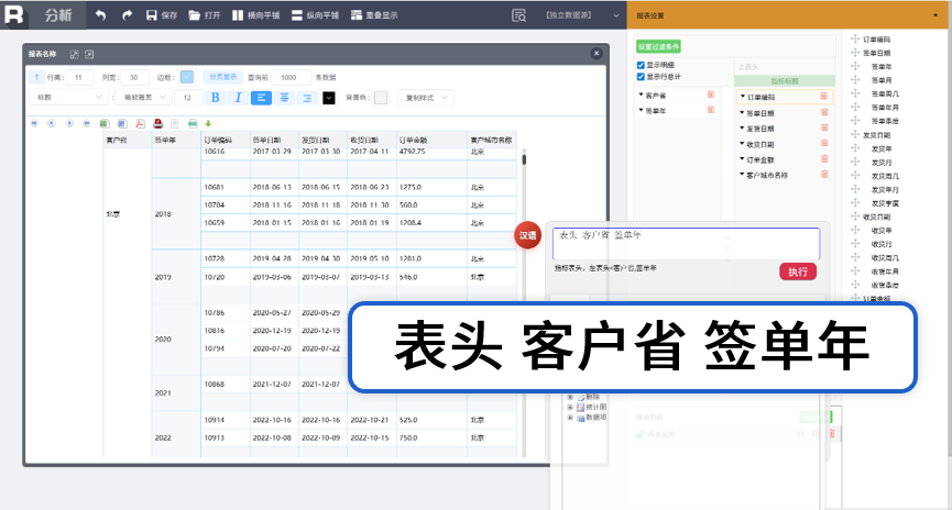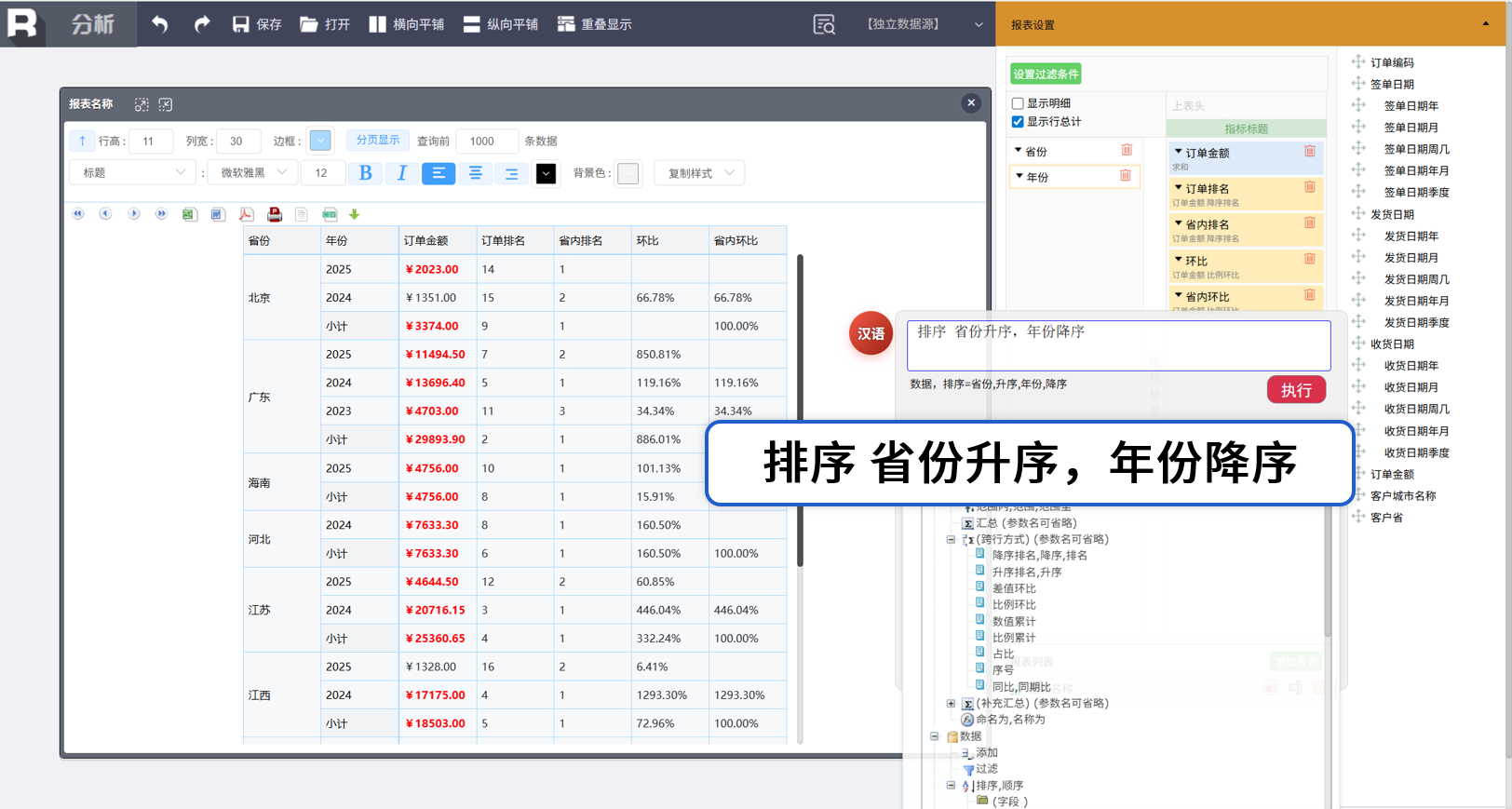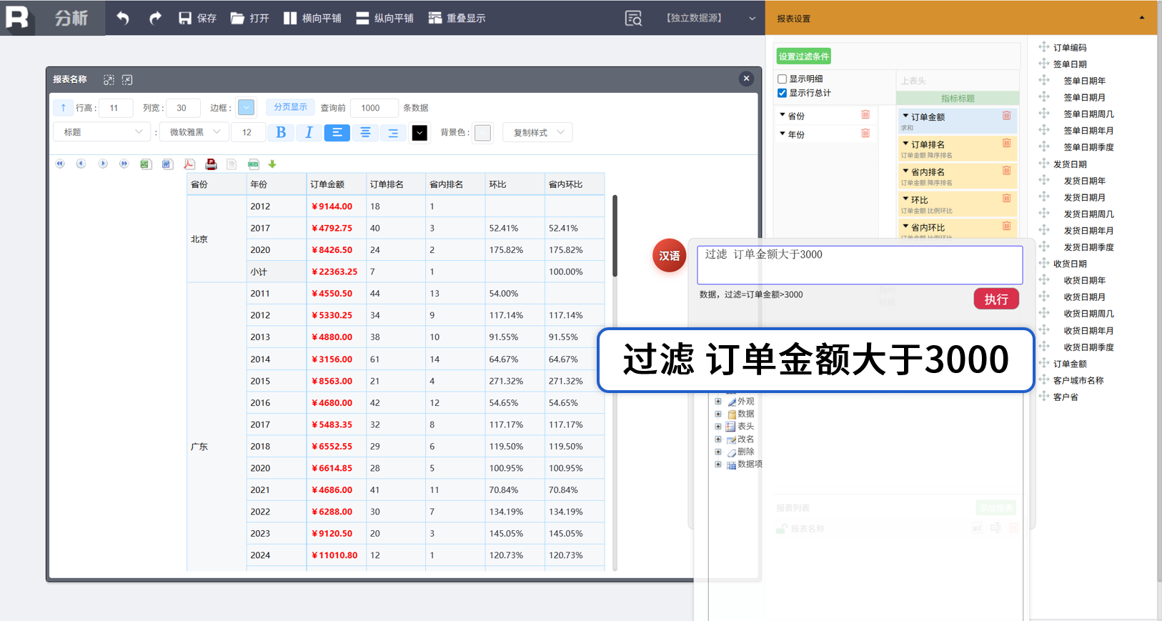 • 基础字段:直接映射到表字段,如“订单金额” • 计算字段:通过表达式定义,如BMI指数 = (体重(kg) / 身高(m)²) • 外键字段:通过关联引入其他表信息,如通过“客户ID”引入“客户名称” |
