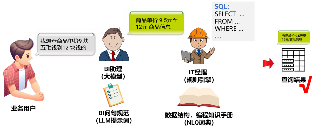 润乾 NLQ 创新地使用规范文本作为中间层,让用户有了确认正确性的能力以消除幻觉,继而使用规则引擎实现准确的SQL生成。内置的中间层MQL覆盖了 多种典型查询范式,保证了复杂查询能力。大模型只需负责多样化的自然语言与规范文本之间的转换。这种机制下,润乾NLQ可以同时兼顾灵活性、准确性与复杂性。而且,这种架构还有巨大成本优势,为 Text2SQL 的实用化提供了一条可行的工程路径。